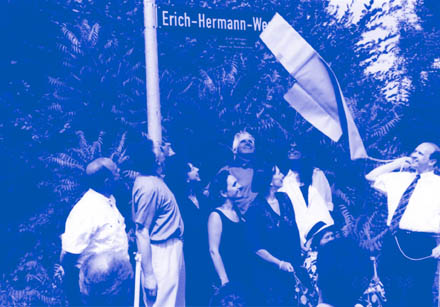 Bezirksvorsteher Wiedemann (2.v. links), und Frank Gerlach (1.v. rechts) mit Familie bei der Enthüllung des Strassenschildes.
